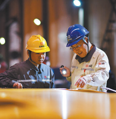 2024年2月21日,全国人大代表、中车齐齐哈尔车辆有限公司货车分厂电焊高级技师王海(右)在生产车间查看车辆焊接技术水平。