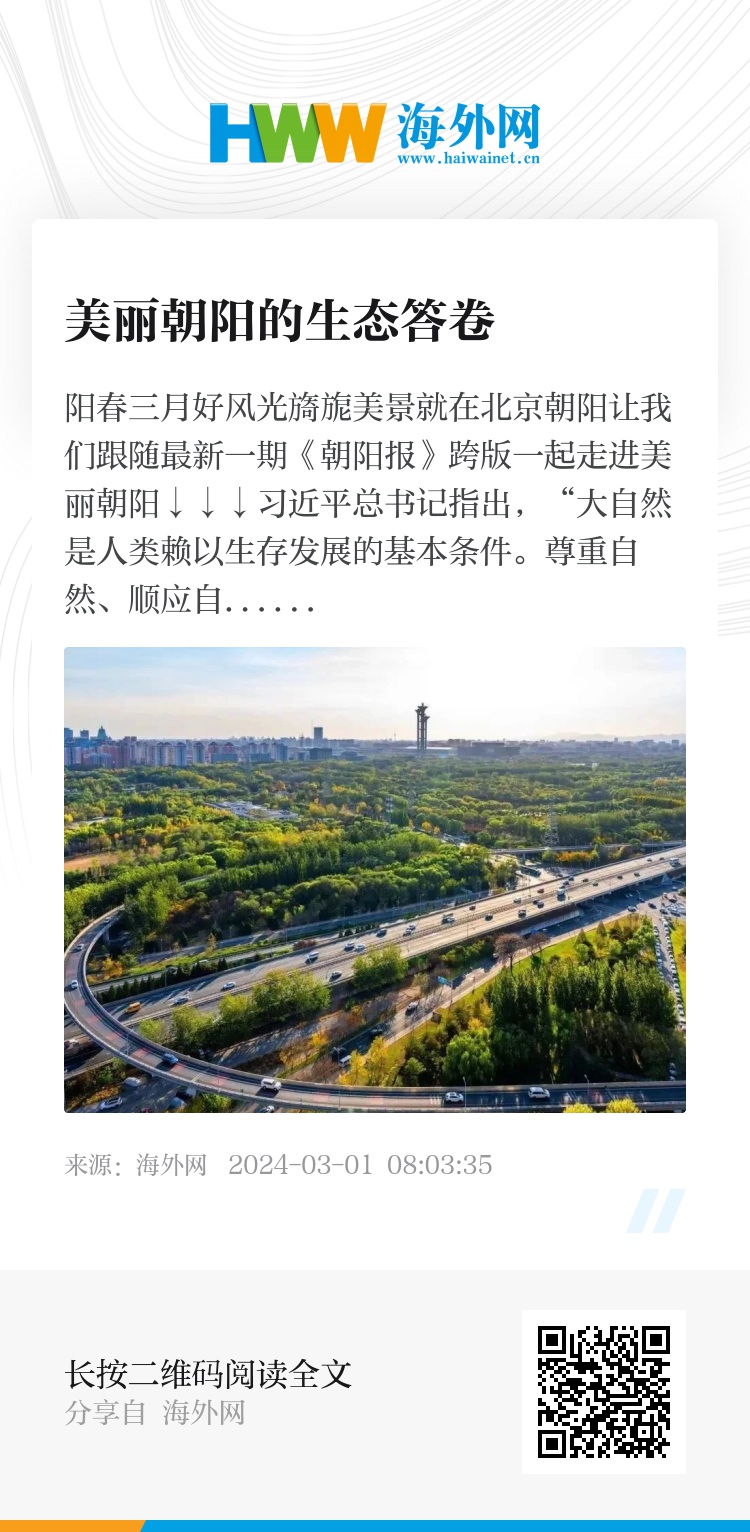 在保护中发展,在发展中保护。当前,朝阳还在加快推进新一轮百万亩造林绿化工程,创建国家森林公园城市。温榆河公园朝阳段二期、朝平公园等重点公园建设紧锣密鼓,区内河湖水系加快联通、亲绿亲水空间持续增加,协同推进降碳、减污、扩绿、增长,继续巩固扩大生态环境质量改善成果,高质量发展的绿色底色持续厚植。