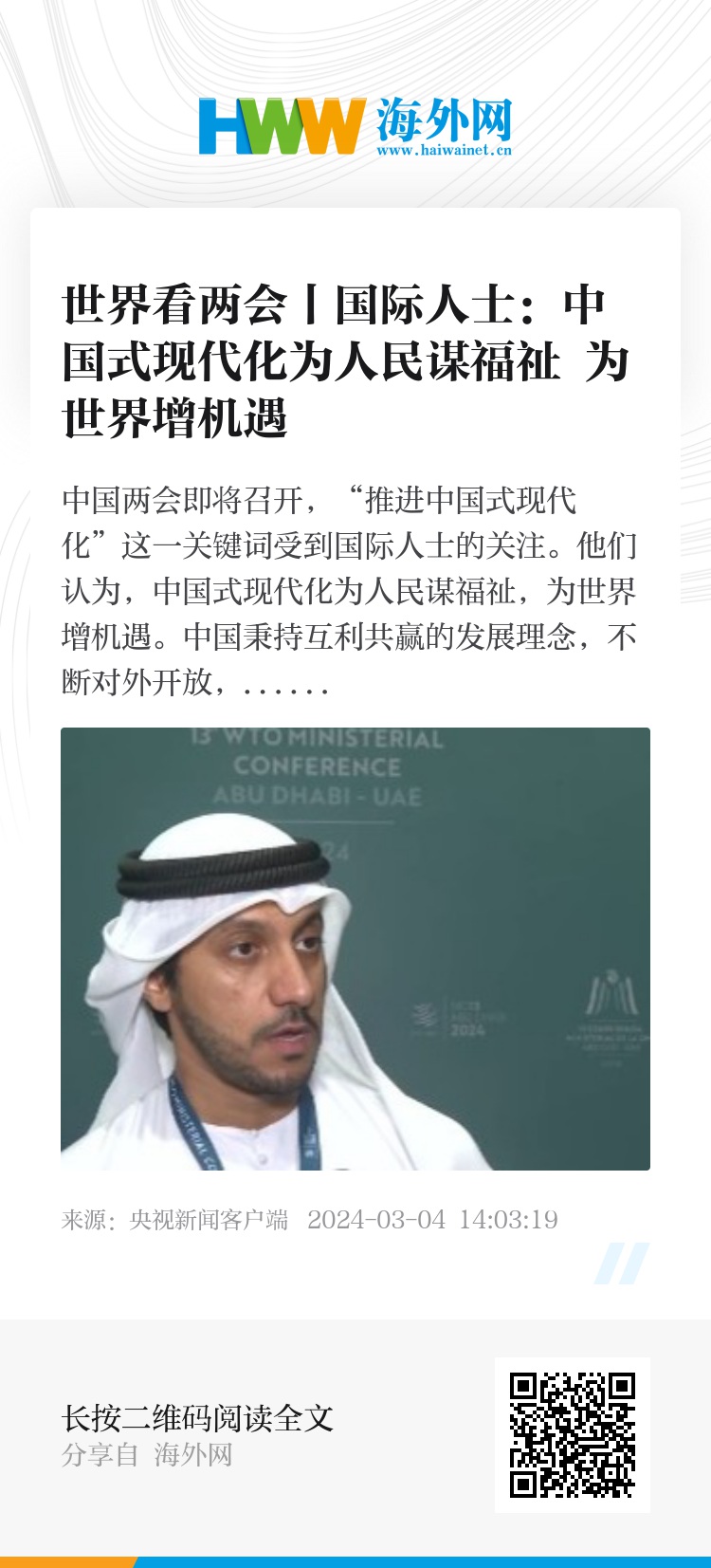 中国两会即将召开,“推进中国式现代化”这一关键词受到国际人士的关注。他们认为,中国式现代化为人民谋福祉,为世界增机遇。中国秉持互利共赢的发展理念,不断对外开放,以自身高质量发展为地区和世界经济发展提供动力。