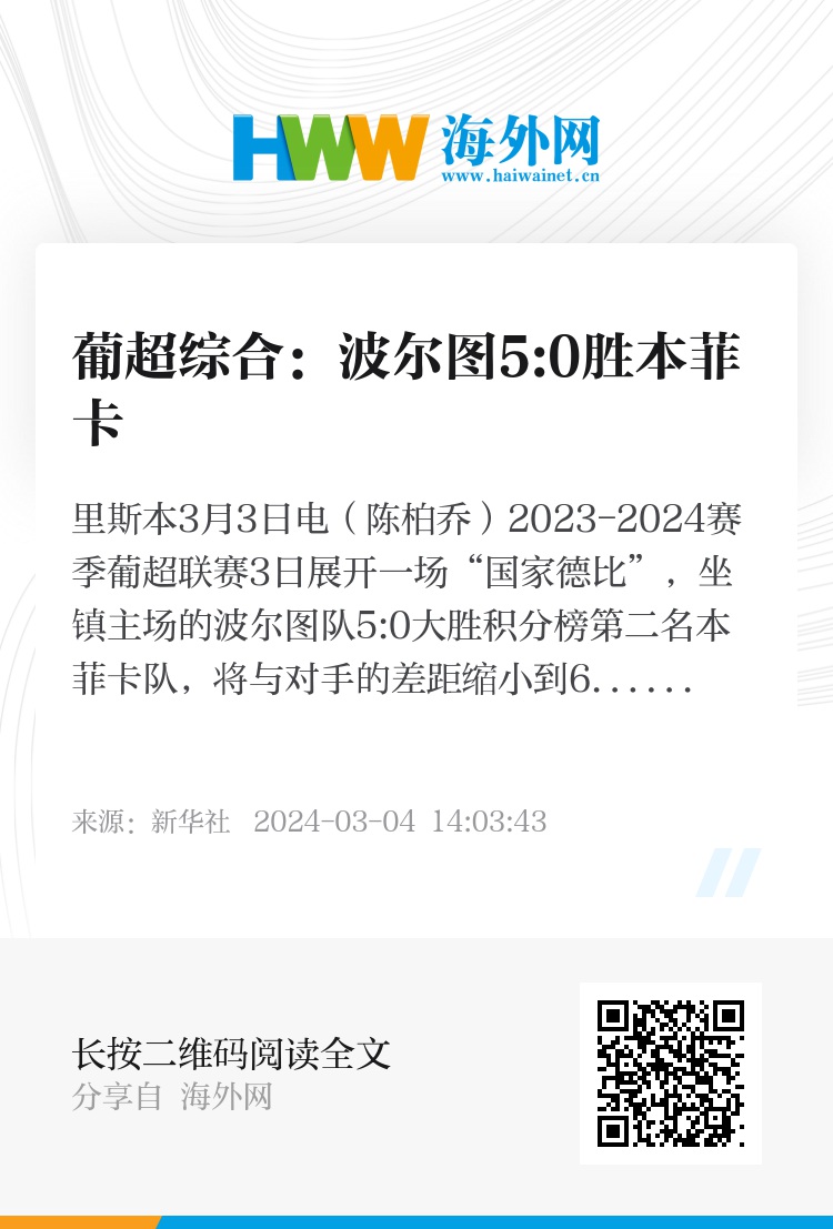 新华社里斯本3月3日电(陈柏乔)2023-2024赛季葡超联赛3日展开一场“国家德比”,坐镇主场的波尔图队5:0大胜积分榜第二名本菲卡队,将与对手的差距缩小到6分。
