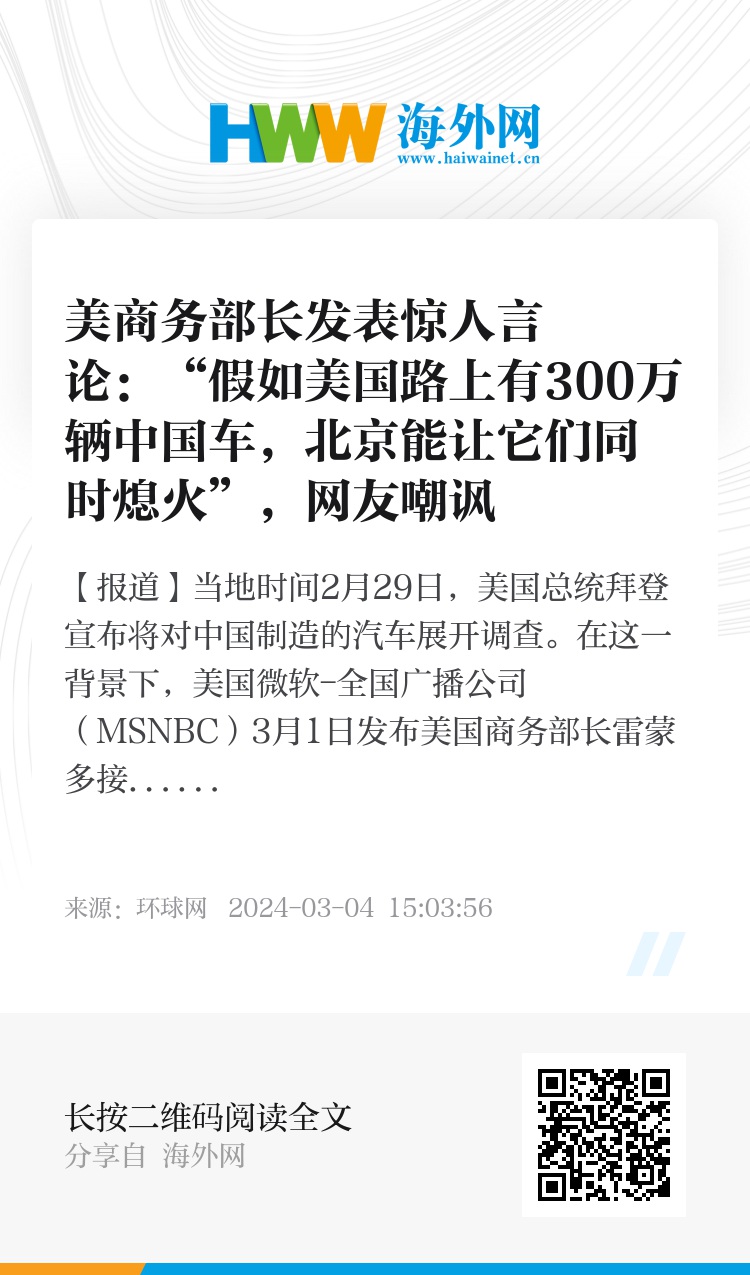 【环球网报道】当地时间2月29日,美国总统拜登宣布将对中国制造的汽车展开调查。在这一背景下,美国微软-全国广播公司(MSNBC)3月1日发布美国商务部长雷蒙多接受该媒体采访视频,期间雷蒙多极力渲染“中国威胁”,对中国汽车发表惊人言论,例如声称中国制造的智能汽车可能“每分钟都在收集数百万美国人的数据”,以及“假如美国路上有300万辆中国车,北京能让它们同时熄火”等。相关言论引发不少网友嘲讽,有人表示,“(这)似乎是一种模式,我们指责别人所做的正是我们自己正在做的。”