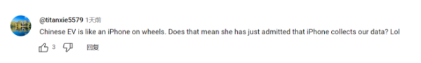 “中国的电动汽车就像装了轮子的苹果手机。这是否意味着她刚刚承认苹果手机收集了我们的数据?哈哈。”