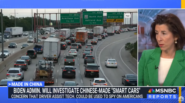 美国微软-全国广播公司(MSNBC)3月1日发布美国商务部长雷蒙多接受该媒体采访视频,雷蒙多在采访中大谈所谓“中国汽车对美国国家安全构成的威胁” 图源:MSNBC视频截图