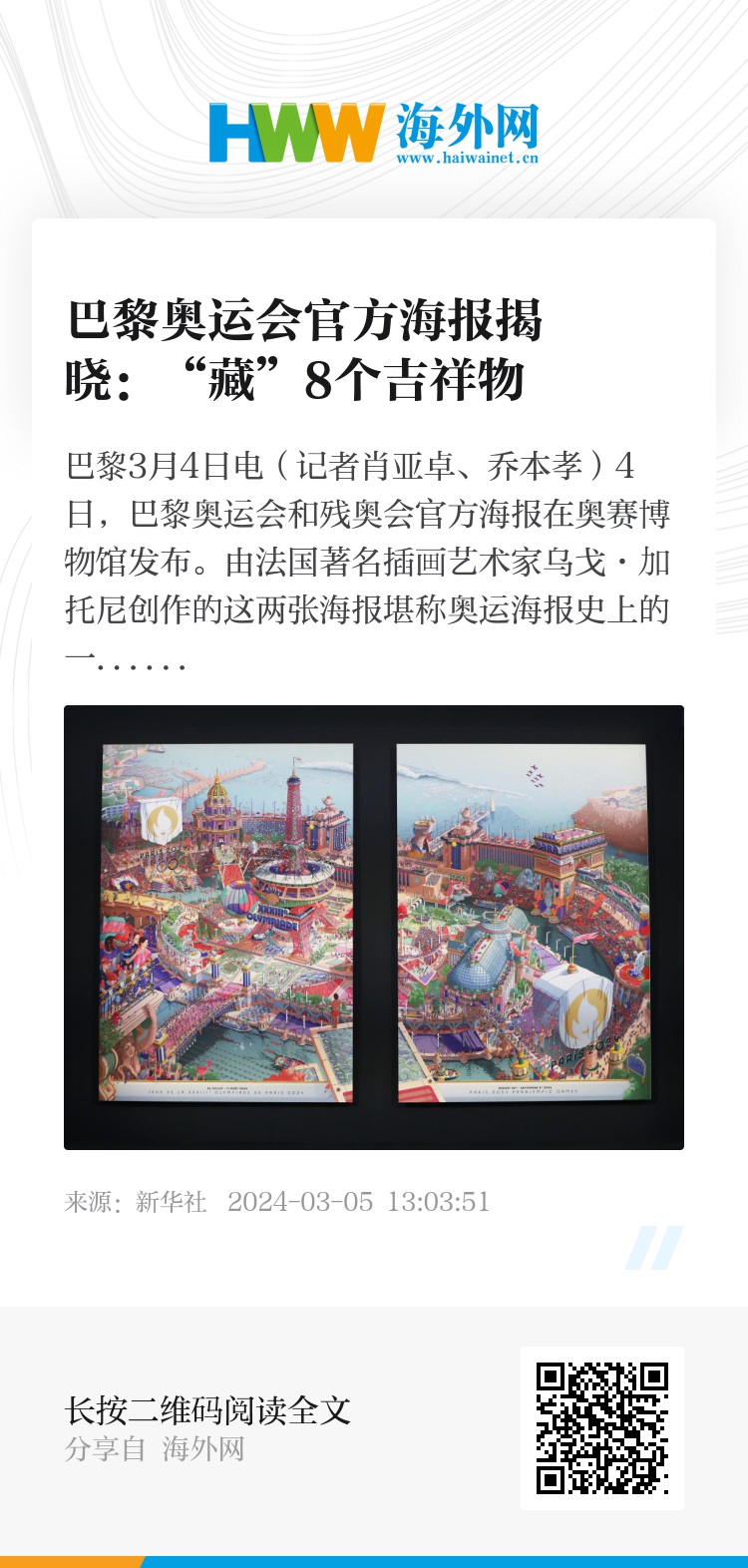 新华社巴黎3月4日电(记者肖亚卓、乔本孝)4日,巴黎奥运会和残奥会官方海报在奥赛博物馆发布。由法国著名插画艺术家乌戈·加托尼创作的这两张海报堪称奥运海报史上的一次大幅创新,其所包含元素之多、细节之丰富均打破了以往奥运海报设计的传统。