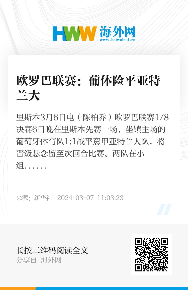新华社里斯本3月6日电(陈柏乔)欧罗巴联赛1/8决赛6日晚在里斯本先赛一场,坐镇主场的葡萄牙体育队1:1战平意甲亚特兰大队,将晋级悬念留至次回合比赛。