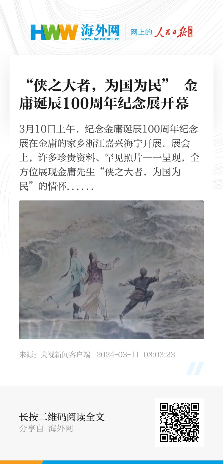 3月10日上午,纪念金庸诞辰100周年纪念展在金庸的家乡浙江嘉兴海宁开展。展会上,许多珍贵资料、罕见照片一一呈现,全方位展现金庸先生“侠之大者,为国为民”的情怀与风采。