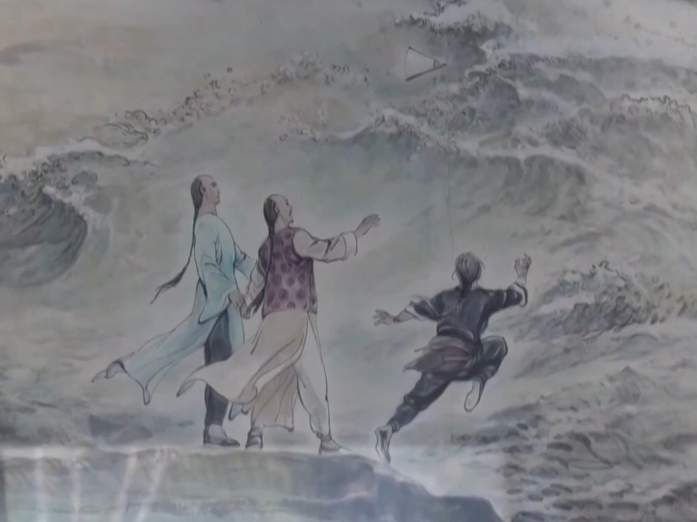 “飞雪连天射白鹿,笑书神侠倚碧鸳”,金庸的武侠小说一直深受广大书迷的喜爱。走进展厅,一幅特别绘制的《海宁观潮图》,再现了金庸先生第一部小说《书剑恩仇录》中陈家洛与乾隆在钱塘江畔抚琴观潮的场景,是中国香港著名画家李志清先生为本次展览特别绘制的。