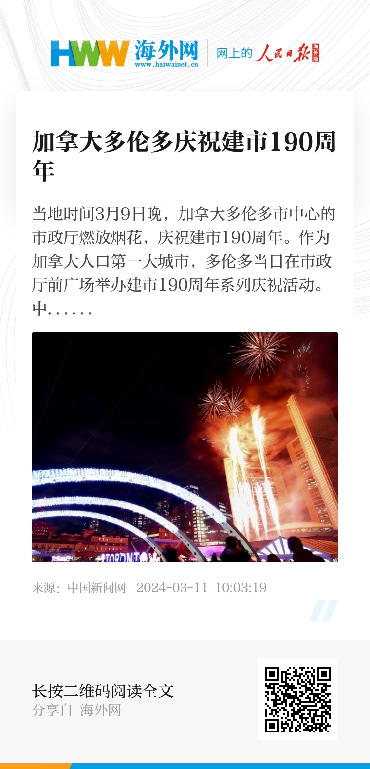 当地时间3月9日晚,加拿大多伦多市中心的市政厅燃放烟花,庆祝建市190周年。作为加拿大人口第一大城市,多伦多当日在市政厅前广场举办建市190周年系列庆祝活动。
