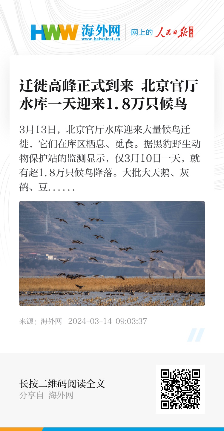 3月13日,北京官厅水库迎来大量候鸟迁徙,它们在库区栖息、觅食。据黑豹野生动物保护站的监测显示,仅3月10日一天,就有超1.8万只候鸟降落。大批大天鹅、灰鹤、豆雁、绿头鸭、赤麻鸭等迁徙候鸟飞抵北京官厅水库。图片来源:高泽鸿/视觉中国
