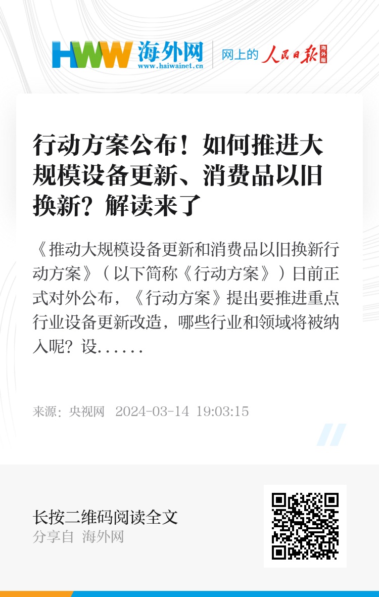 《推动大规模设备更新和消费品以旧换新行动方案》中还提出,实施消费品以旧换新行动,哪些消费品有望入选,又将有哪些利好举措?
