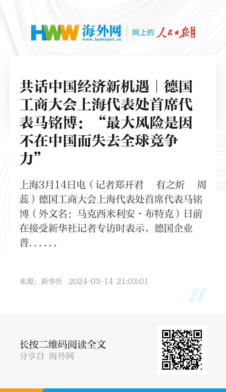 新华社上海3月14日电(记者郑开君 有之炘 周蕊)德国工商大会上海代表处首席代表马铭博(外文名:马克西米利安·布特克)日前在接受新华社记者专访时表示,德国企业普遍看好中国投资环境,认为“最大的风险是因不在中国发展而失去全球竞争力”。
