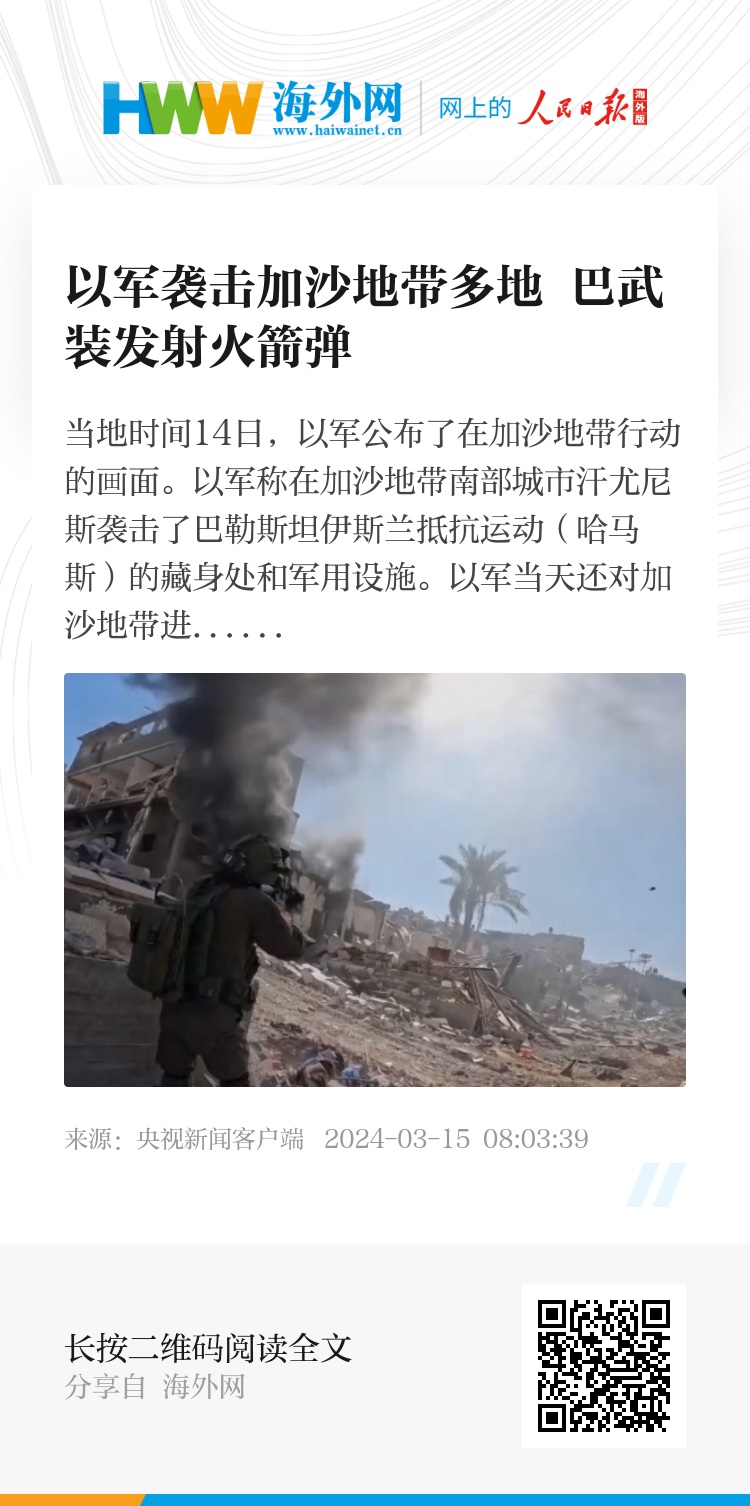 当地时间14日,以军公布了在加沙地带行动的画面。以军称在加沙地带南部城市汗尤尼斯袭击了巴勒斯坦伊斯兰抵抗运动(哈马斯)的藏身处和军用设施。以军当天还对加沙地带进行了密集的空袭。