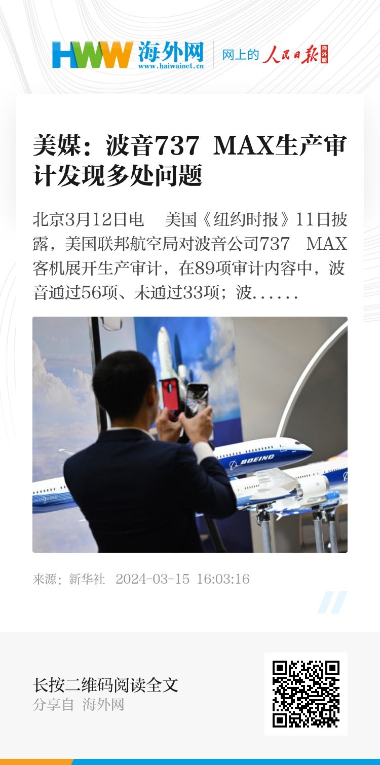 新华社北京3月12日电 美国《纽约时报》11日披露,美国联邦航空局对波音公司737 MAX客机展开生产审计,在89项审计内容中,波音通过56项、未通过33项;波音机身供应商势必锐航空系统公司在接受的13项审计内容中,7项存在问题。