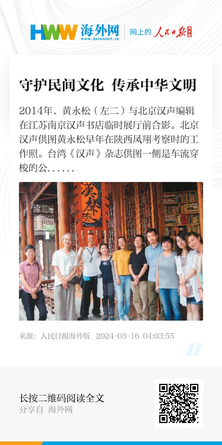 数十年来,黄永松带领汉声同仁致力于民间文化的整理报道和地方风物的保护,并与两岸多所高校及研究机构、众多专家学者合作开展调研。在清华大学美术学院担任教授的杨阳告诉记者,《汉声》杂志把两岸学者紧紧地联系在一起,黄永松等人对民间艺术的尊重和保护令人敬佩,他们对出版工作的认真严谨值得学习。汉声在北京设有办公室,她会推荐学生去实习。“我带学生去拜访黄先生时,他对年轻人的鼓励是那么真挚恳切,给予年轻人巨大的信心和力量。”杨阳说。