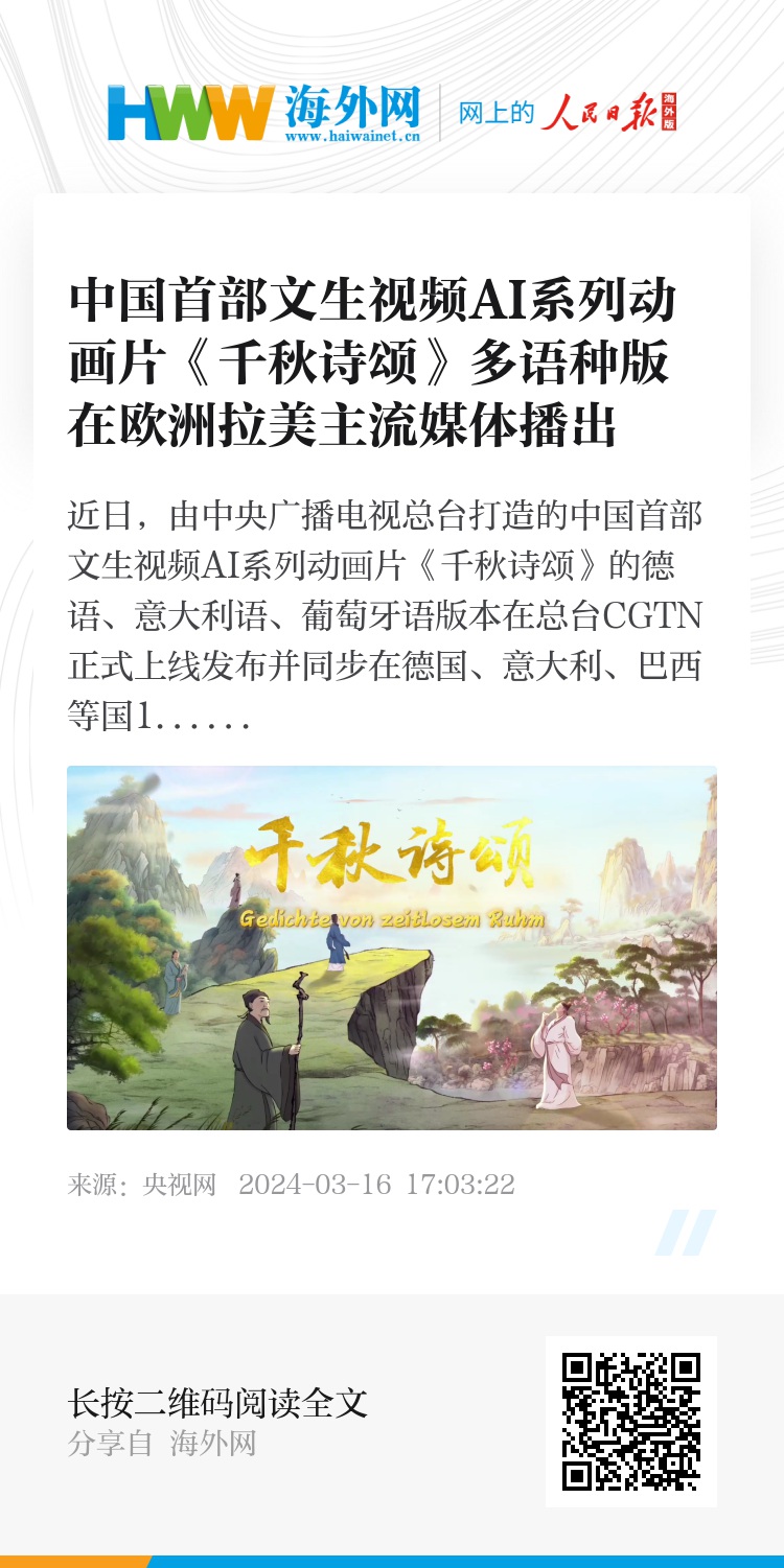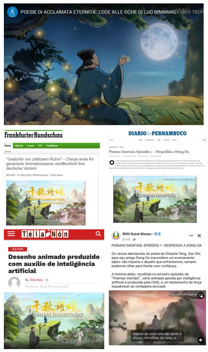 近日,由中央广播电视总台打造的中国首部文生视频AI系列动画片《千秋诗颂》的德语、意大利语、葡萄牙语版本在总台CGTN正式上线发布并同步在德国、意大利、巴西等国10余家主流媒体播出,触达海外受众近1亿。