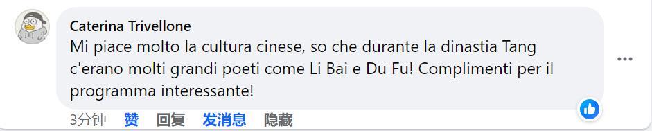 意大利语网友留言表示:“这个动画片制作精良!我也想学做这样创意潮流的产品,求助!”“我特别喜欢中国文化,我知道唐代出了很多李白、杜甫这样有名的大诗人。祝贺你们制作了这样有意义的节目”。