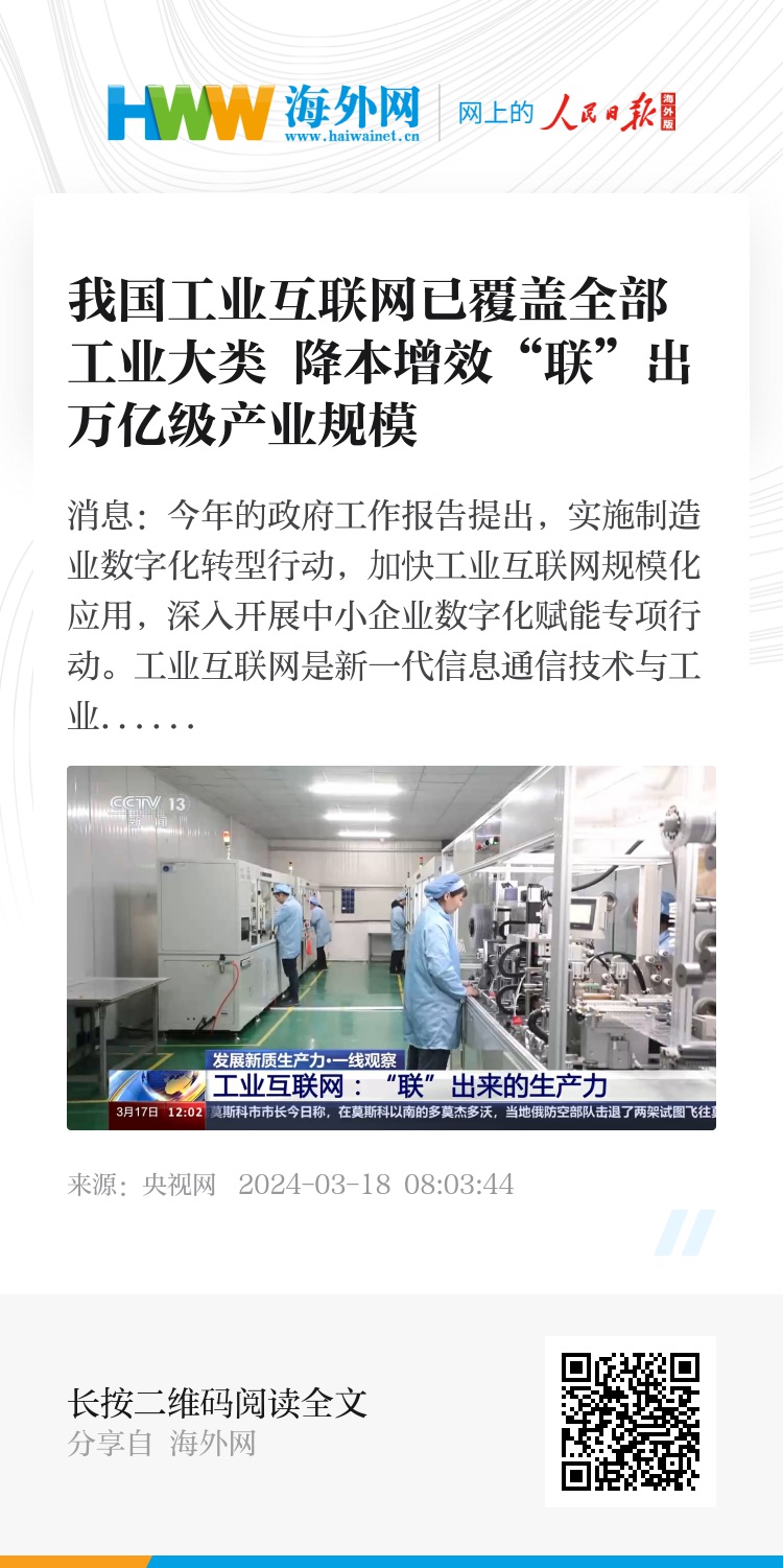 央视网消息:今年的政府工作报告提出,实施制造业数字化转型行动,加快工业互联网规模化应用,深入开展中小企业数字化赋能专项行动。工业互联网是新一代信息通信技术与工业经济深度融合的新型基础设施、应用模式和工业生态。