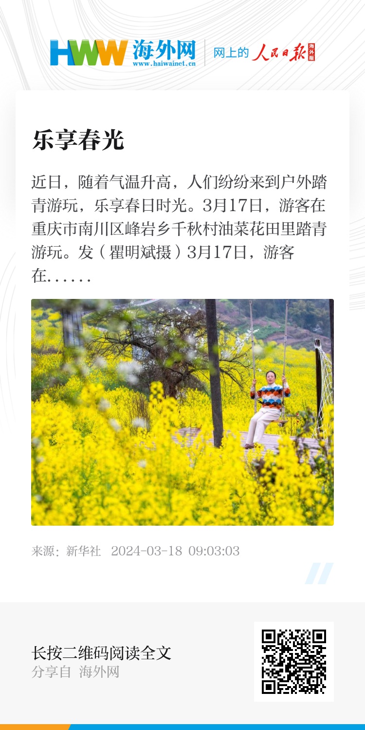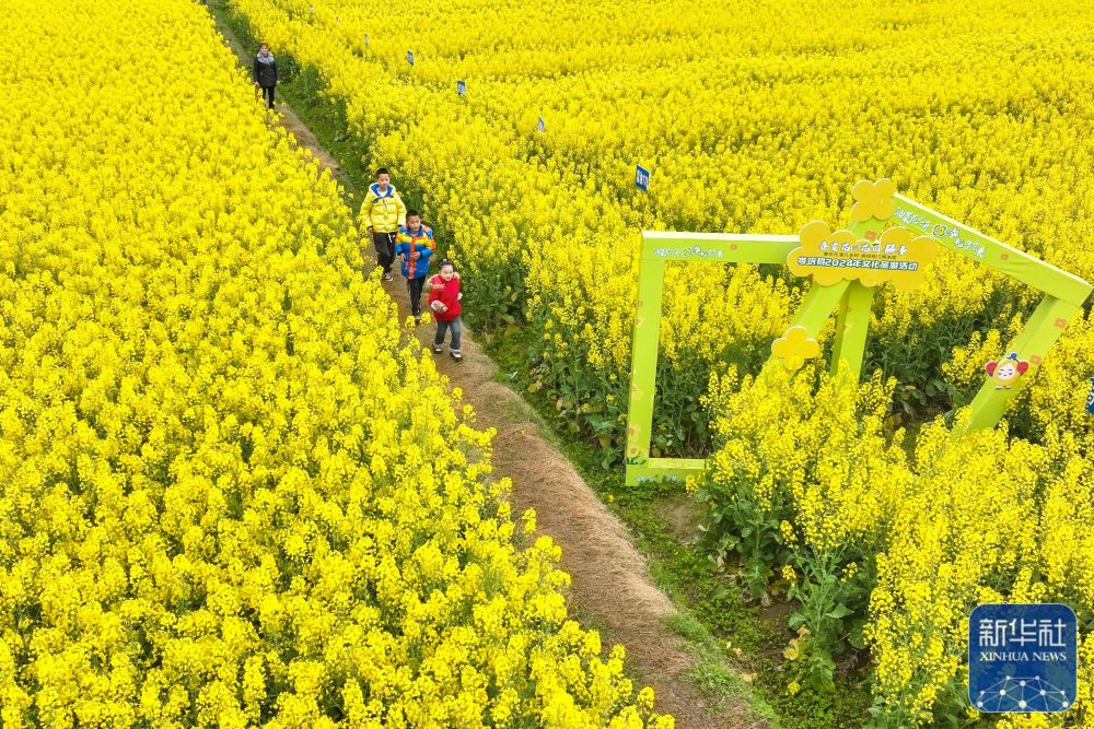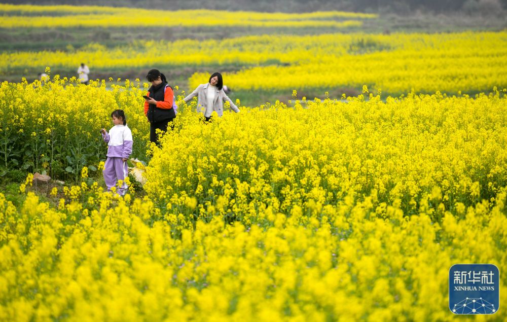 3月17日,游客在重庆市南川区峰岩乡千秋村油菜花田里踏青游玩。新华社发(瞿明斌摄)