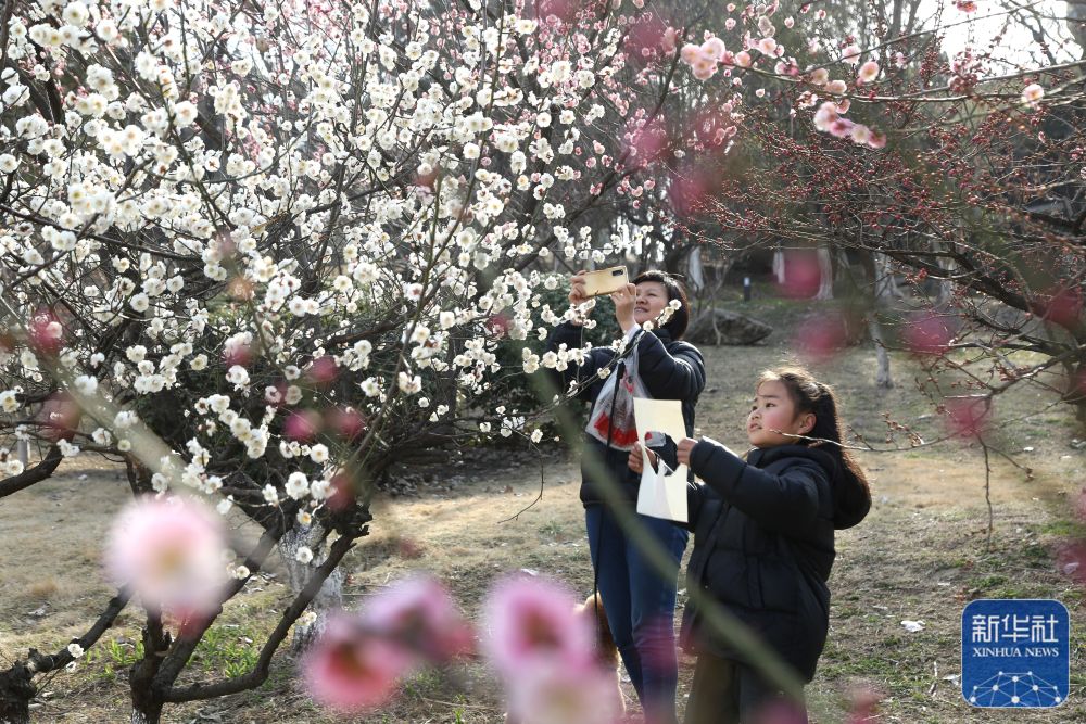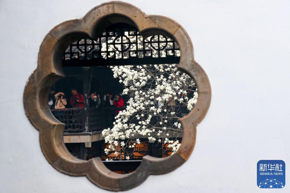 3月17日,游客在江苏扬州何园景区赏花拍照。新华社发(齐立广摄)