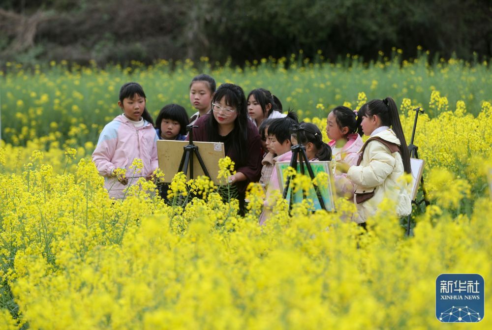 3月17日,人们在贵州省开阳县米坪乡油菜花田里写生。新华社发(袁福洪摄)