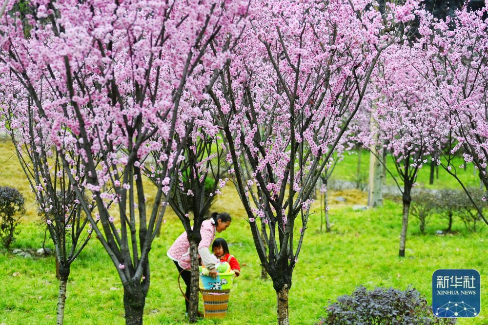 3月17日,游客在重庆市北碚区澄江镇民权村天歌园水蜜桃采摘基地游玩。新华社发(秦廷富摄)