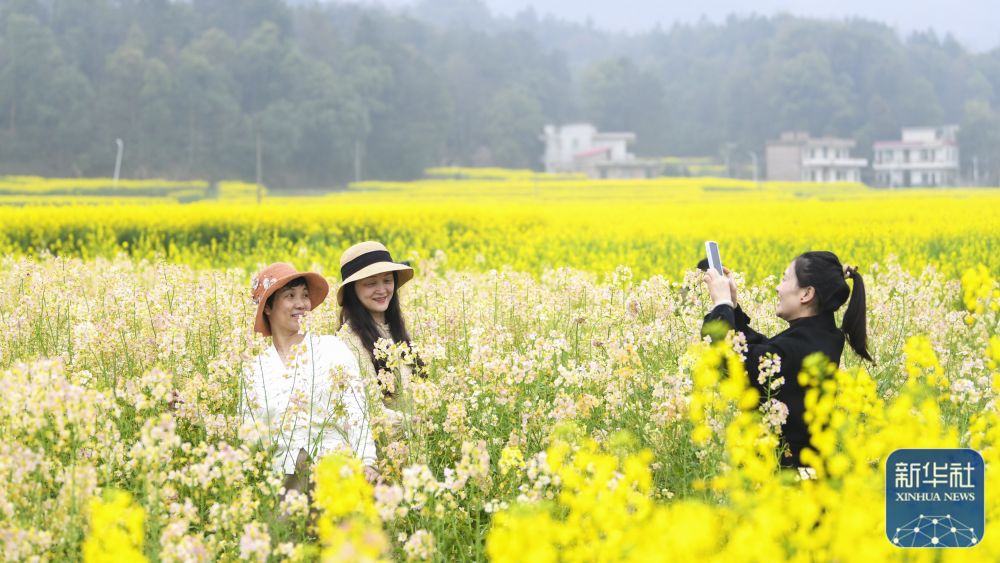 3月17日,人们在湖南省永州市双牌县泷泊镇枫木山村油菜花田赏花游玩。新华社发(蒋克青摄)
