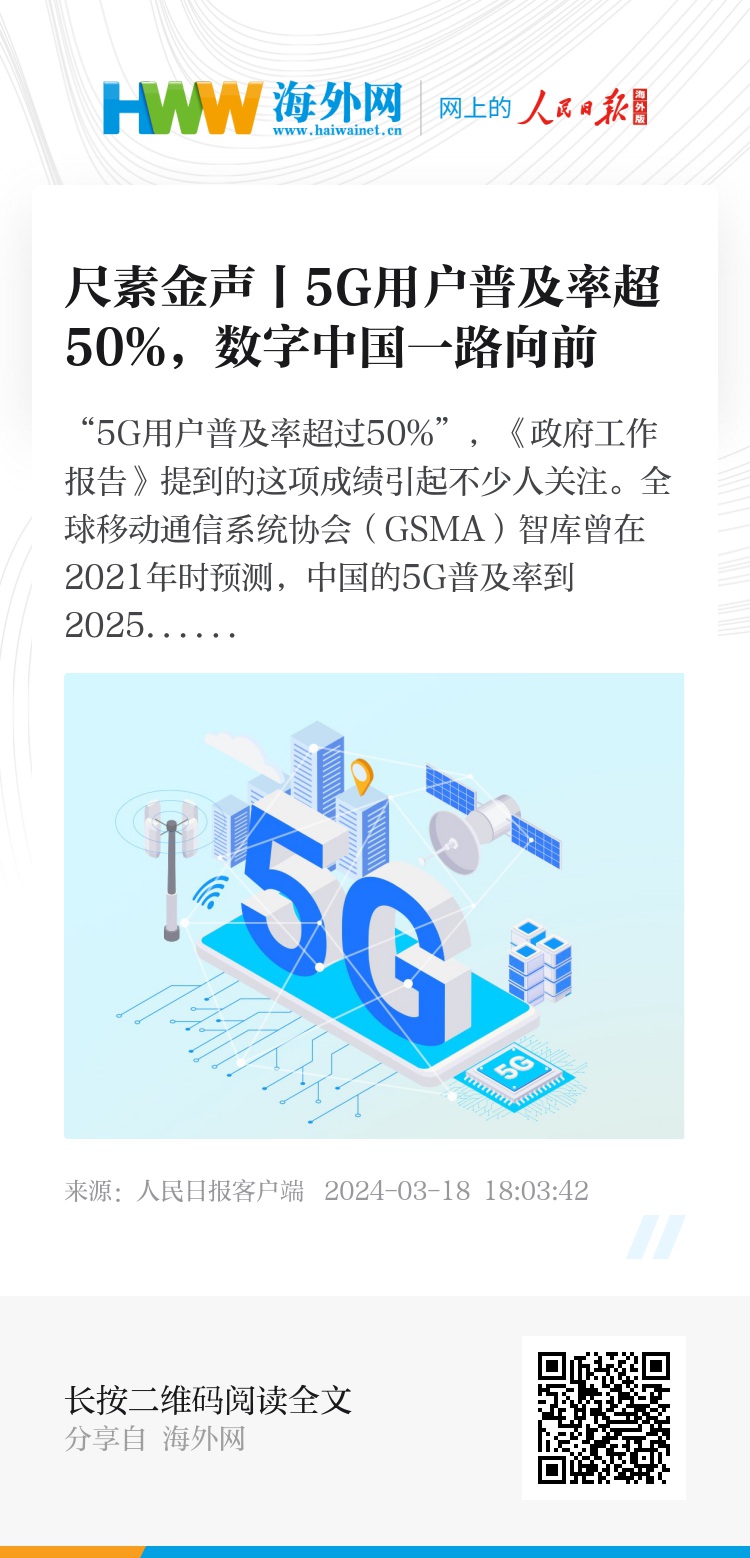 “5G用户普及率超过50%”,《政府工作报告》提到的这项成绩引起不少人关注。全球移动通信系统协会(GSMA)智库曾在2021年时预测,中国的5G普及率到2025年将超过50%,如今,我们整整提早了2年。