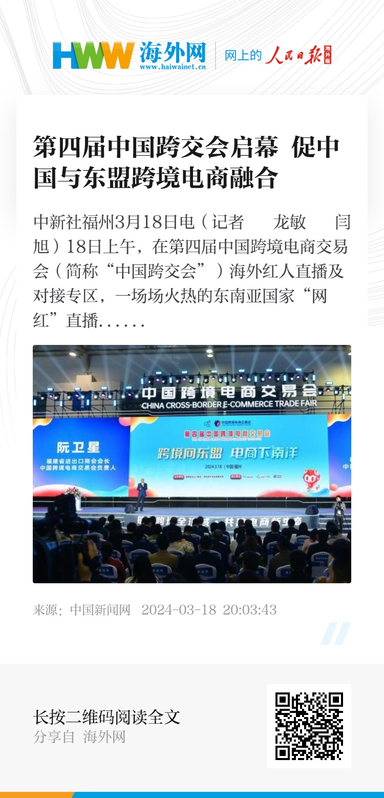 中新社福州3月18日电(记者 龙敏 闫旭)18日上午,在第四届中国跨境电商交易会(简称“中国跨交会”)海外红人直播及对接专区,一场场火热的东南亚国家“网红”直播带货活动拉近了中国和东盟消费者的距离。