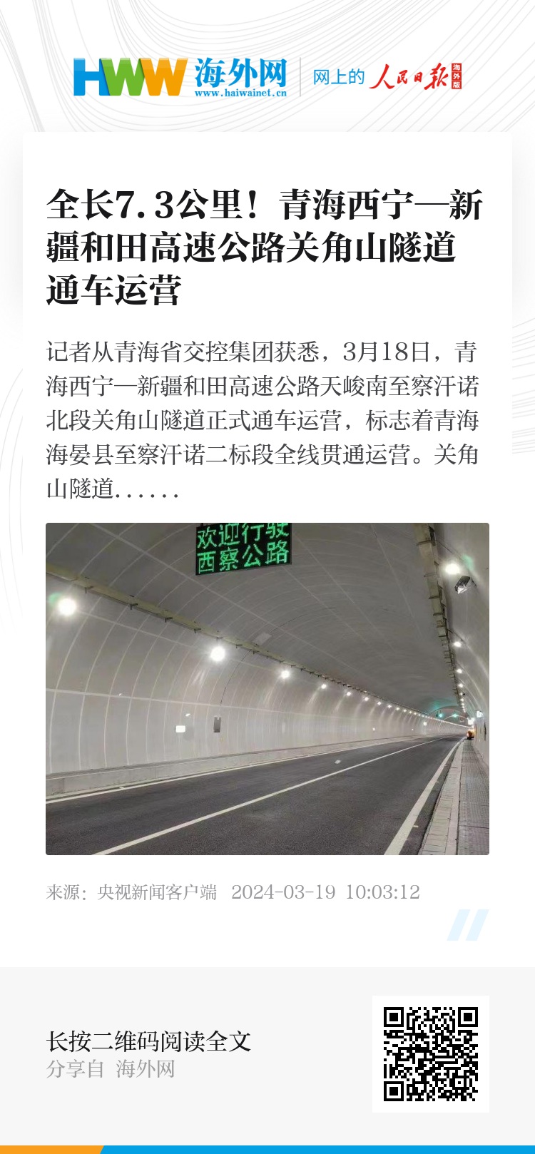 记者从青海省交控集团获悉,3月18日,青海西宁—新疆和田高速公路天峻南至察汗诺北段关角山隧道正式通车运营,标志着青海海晏县至察汗诺二标段全线贯通运营。