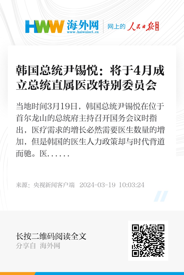 尹锡悦还表示,今年4月将成立总统直属医疗改革特别委员会,将与医疗界等各界代表以及专家一起深入讨论医疗改革课题。期待包括实习和住院医生在内的医生团体也参与其中,通过讨论共同制定医疗改革的具体实施方案。