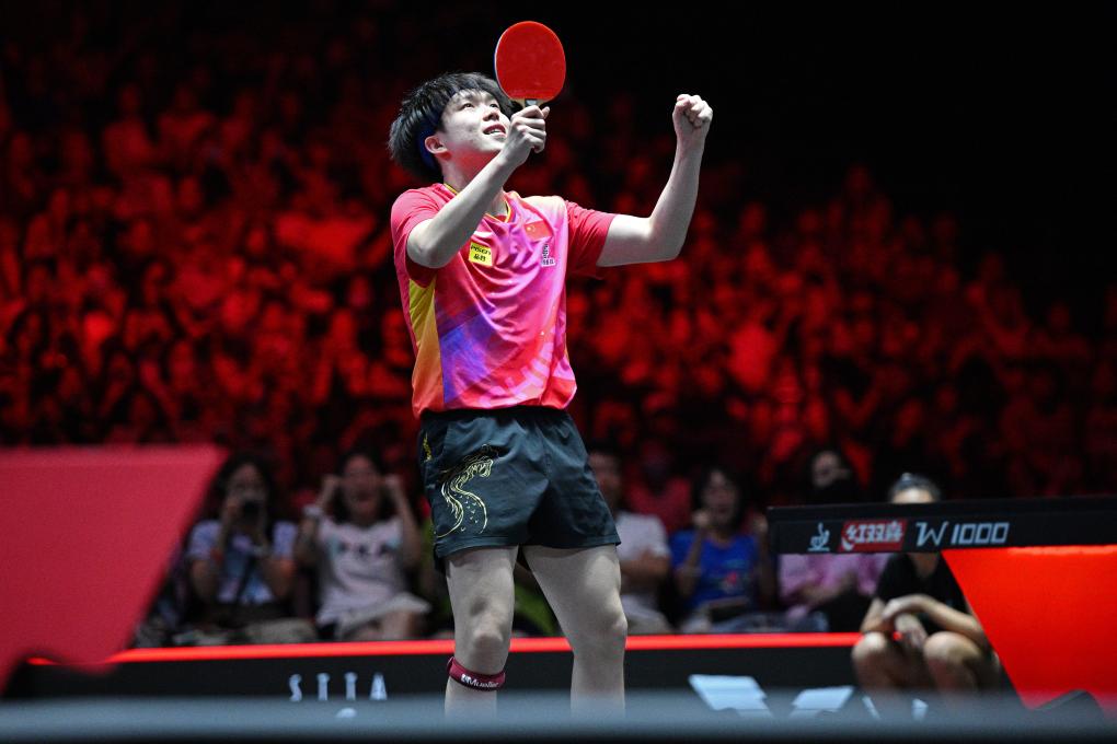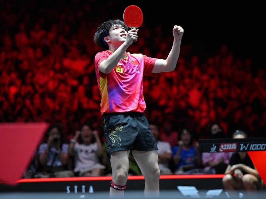 3月17日,在WTT新加坡大满贯男单决赛中,中国选手王楚钦4比1战胜队友梁靖崑,夺得冠军。新华社发(邓智炜摄)