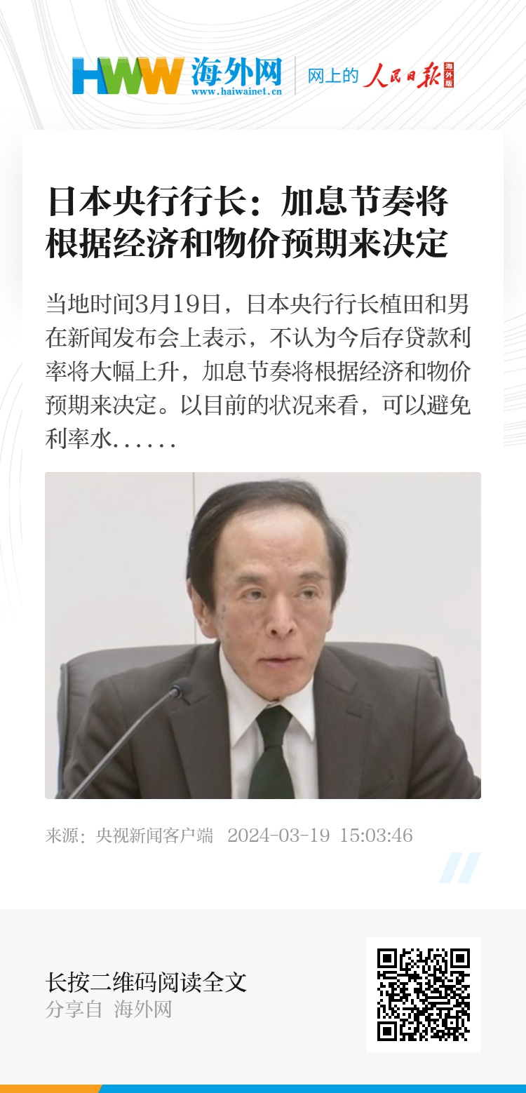 当地时间3月19日,日本央行行长植田和男在新闻发布会上表示,不认为今后存贷款利率将大幅上升,加息节奏将根据经济和物价预期来决定。以目前的状况来看,可以避免利率水平快速上升。(总台记者 刘茁野)