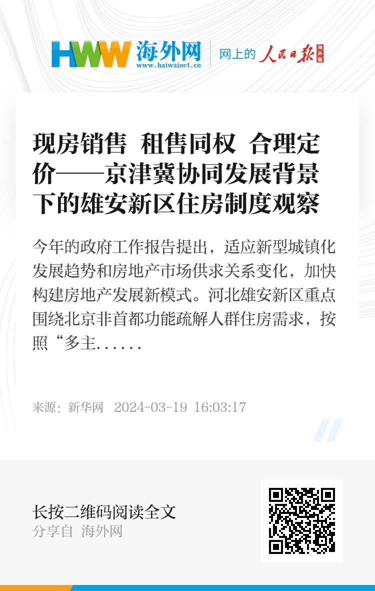 今年的政府工作报告提出,适应新型城镇化发展趋势和房地产市场供求关系变化,加快构建房地产发展新模式。河北雄安新区重点围绕北京非首都功能疏解人群住房需求,按照“多主体供给、多渠道保障、租购并举”的要求,建立“以需定供、房地联动、分类保障、职住平衡”的新型住房制度。一年来,通过推行现房销售、租售同权、合理定价等政策,有效破解当前住房市场中存在的一些现实问题,获得社会各界认同。