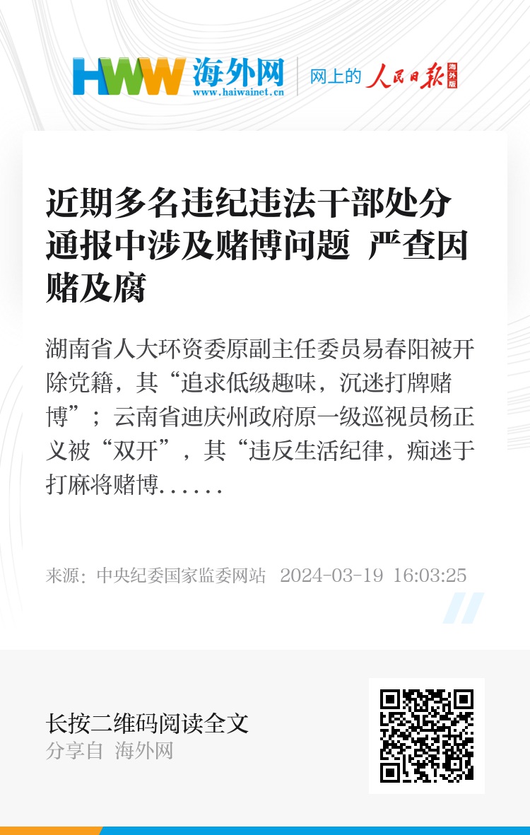 湖南省人大环资委原副主任委员易春阳被开除党籍,其“追求低级趣味,沉迷打牌赌博”;云南省迪庆州政府原一级巡视员杨正义被“双开”,其“违反生活纪律,痴迷于打麻将赌博”……近期,多名违纪违法党员干部的处分通报中涉及赌博问题。
