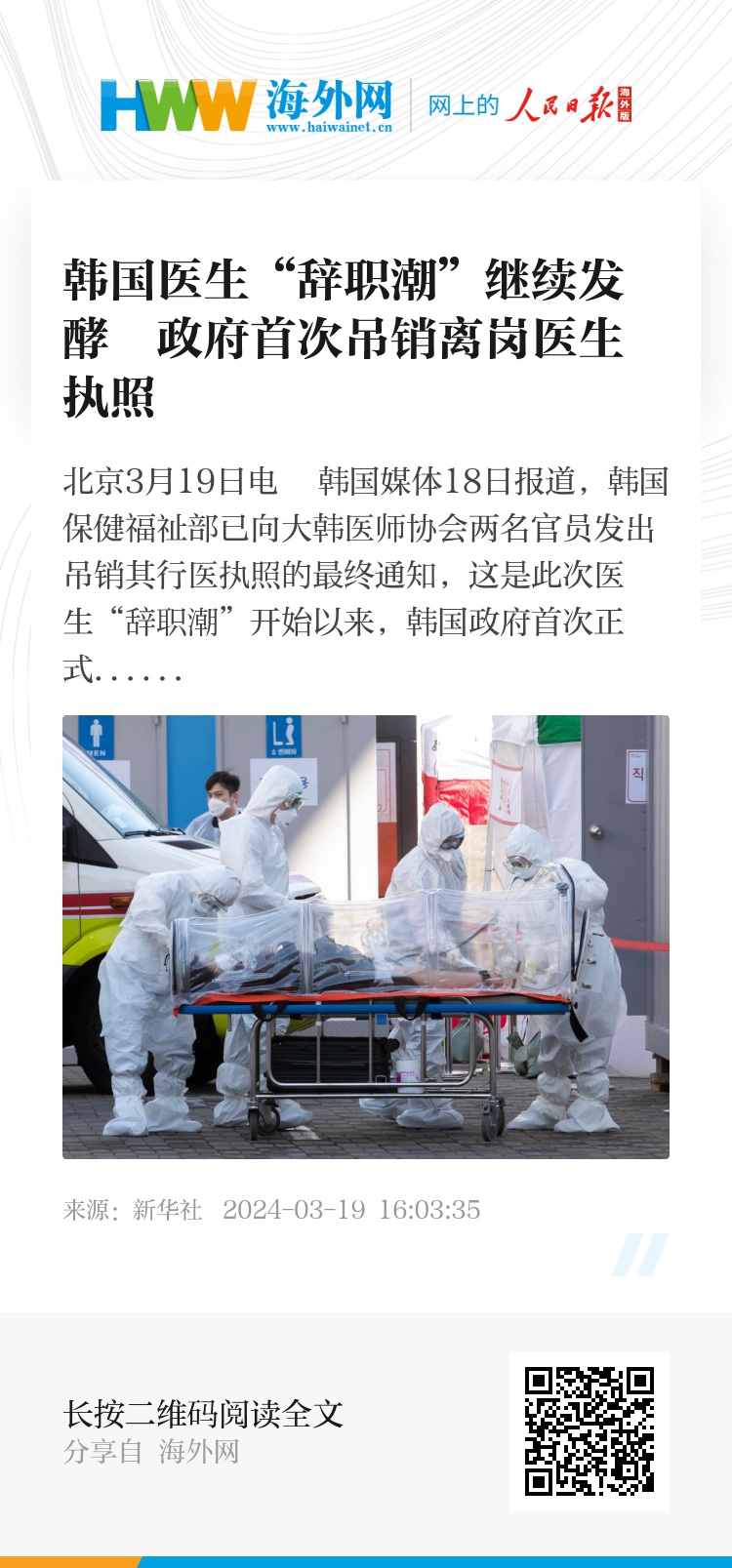 新华社北京3月19日电 韩国媒体18日报道,韩国保健福祉部已向大韩医师协会两名官员发出吊销其行医执照的最终通知,这是此次医生“辞职潮”开始以来,韩国政府首次正式吊销离岗医生行医执照。