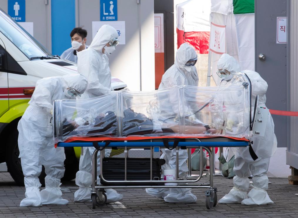 2020年3月11日,在韩国首尔,医护人员将一名患者从救护车转送至医院。新华社发(李相浩摄)