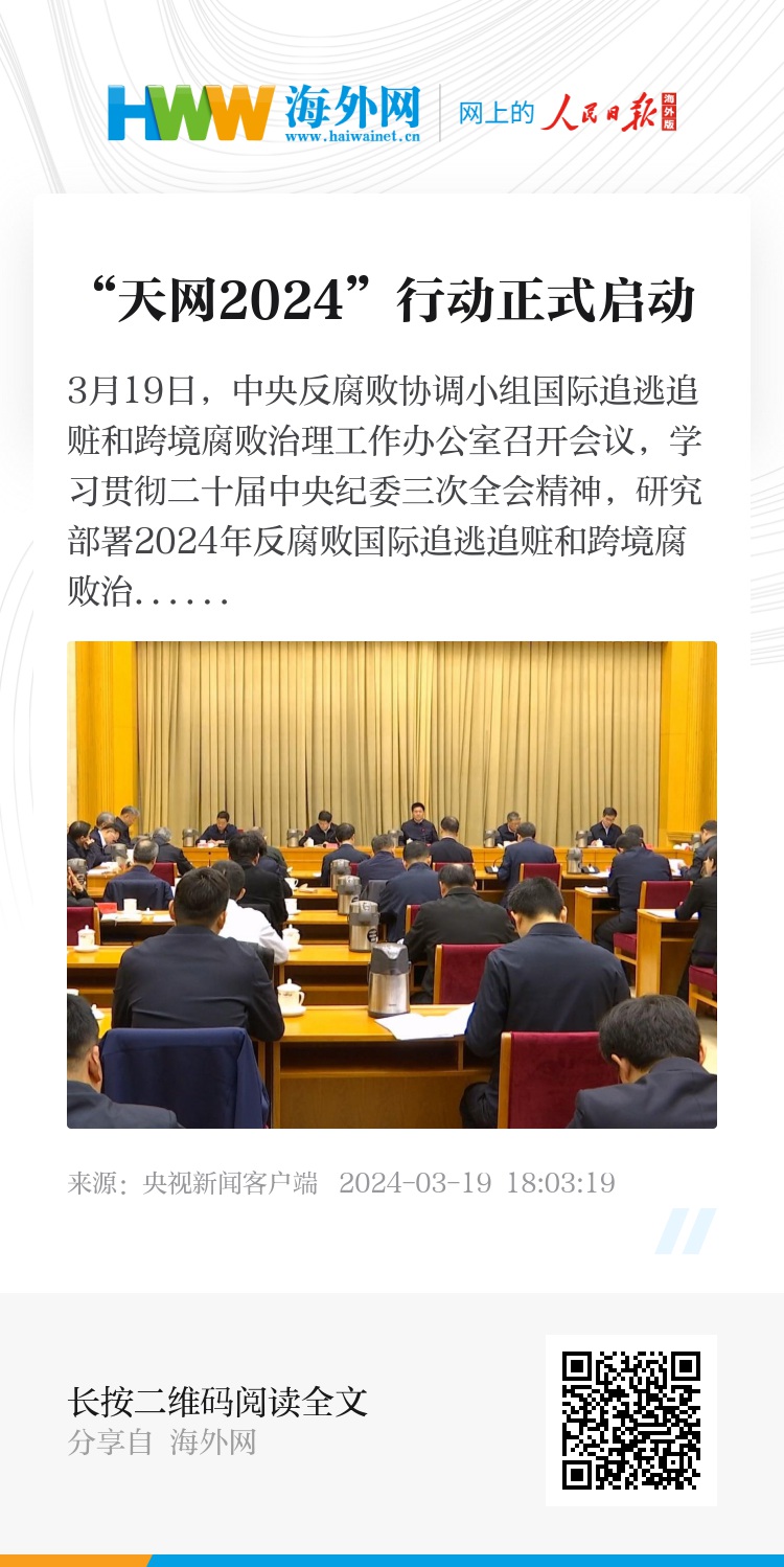 3月19日,中央反腐败协调小组国际追逃追赃和跨境腐败治理工作办公室召开会议,学习贯彻二十届中央纪委三次全会精神,研究部署2024年反腐败国际追逃追赃和跨境腐败治理工作,启动“天网2024”行动。