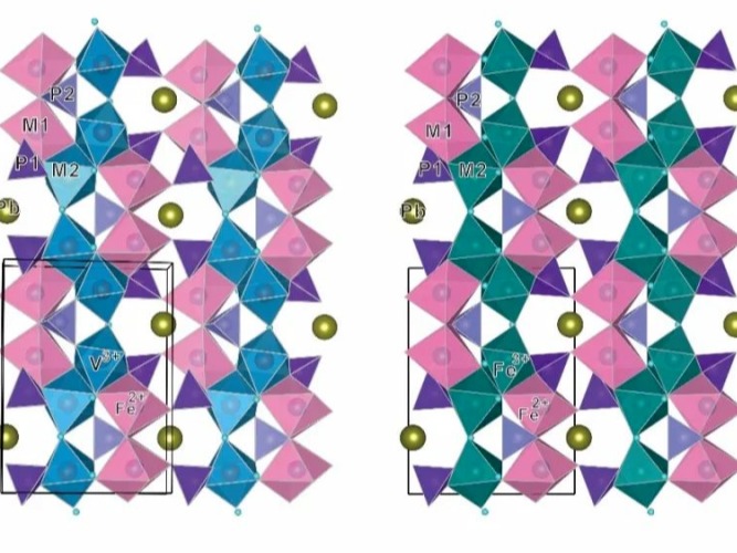 褐磷钒铁铅石和绿磷铁铅石均属于绿磷铝钡石族。这两种磷酸盐新矿物的晶体结构特征与绿磷铝钡石族其他矿物相似,均为单斜晶系,空间群为:P21/m(#11)。V-O八面体或Fe3+-O八面体共棱成对,再共角顶连结成平行b轴的链。Fe2+-O八面体亦共棱成对,八面体对与八面体链共棱连结。P1-O四面体连接八面体链,P2-O四面体连结两种八面体对,Pb2+位于结构的大孔隙中。