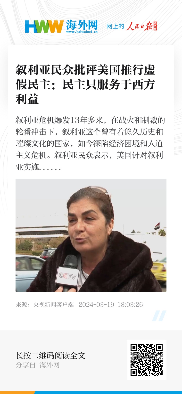 大马士革居民 齐亚德:没有民主,一切都是为了西方国家的目标和利益,民主只服务于西方利益。美西方对我们实施的制裁影响了所有叙利亚民众的生活,甚至在境外的叙利亚人都无法正常转账,没有能力维持基本的生活。
