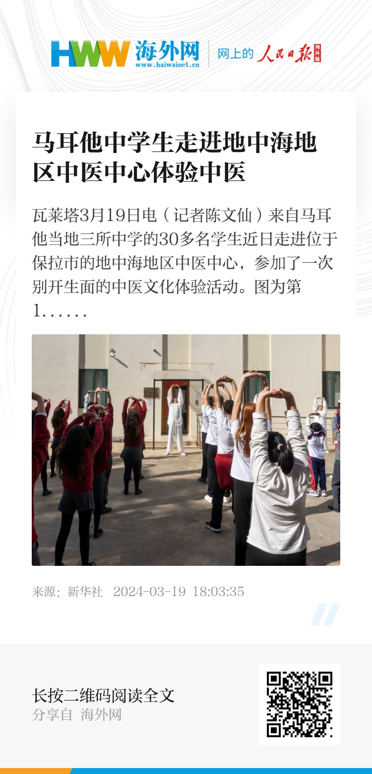 新华网瓦莱塔3月19日电(记者陈文仙)来自马耳他当地三所中学的30多名学生近日走进位于保拉市的地中海地区中医中心,参加了一次别开生面的中医文化体验活动。