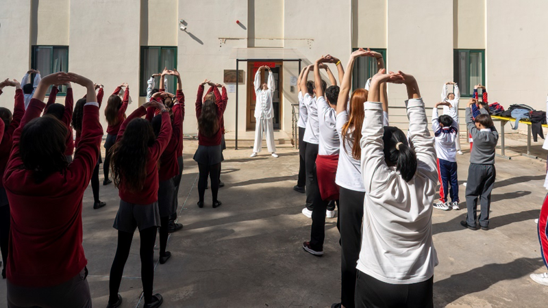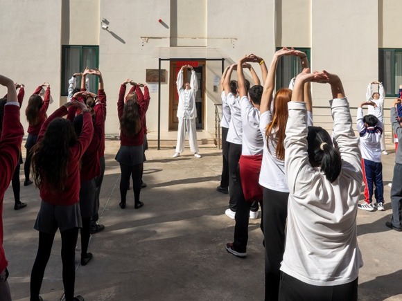 图为第19期援马耳他医疗队杨智杰医生带领学生们练习八段锦。