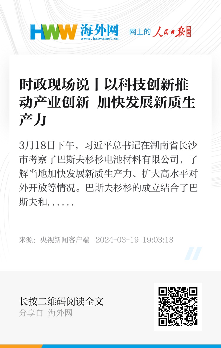 3月18日下午,习近平总书记在湖南省长沙市考察了巴斯夫杉杉电池材料有限公司,了解当地加快发展新质生产力、扩大高水平对外开放等情况。