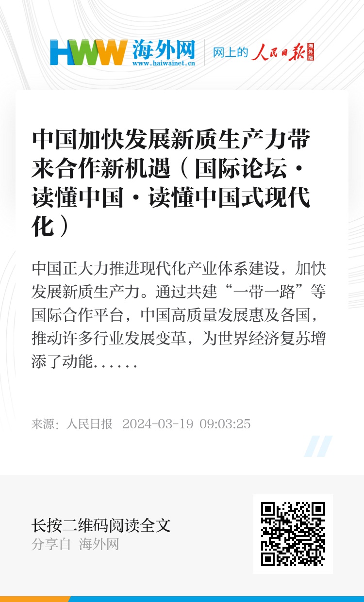 中国正大力推进现代化产业体系建设,加快发展新质生产力。通过共建“一带一路”等国际合作平台,中国高质量发展惠及各国,推动许多行业发展变革,为世界经济复苏增添了动能