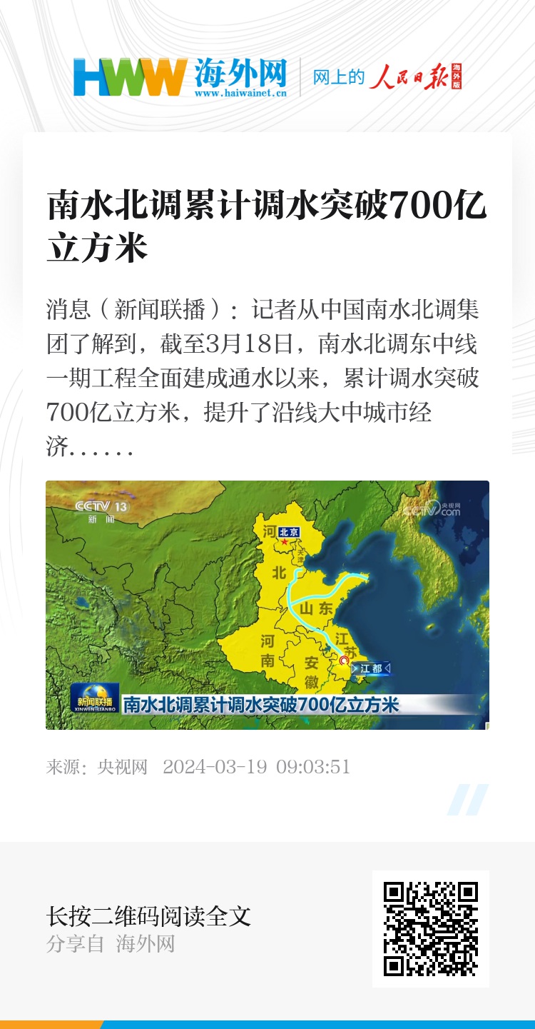 央视网消息(新闻联播):记者从中国南水北调集团了解到,截至3月18日,南水北调东中线一期工程全面建成通水以来,累计调水突破700亿立方米,提升了沿线大中城市经济社会高质量发展空间。