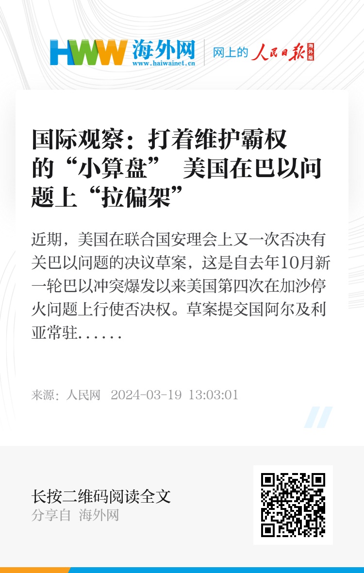 近期,美国在联合国安理会上又一次否决有关巴以问题的决议草案,这是自去年10月新一轮巴以冲突爆发以来美国第四次在加沙停火问题上行使否决权。草案提交国阿尔及利亚常驻联合国代表本贾马指出,“给决议草案投赞成票,就是给数十万儿童带去希望,让他们重返学校并享有受教育的权利;给决议草案投反对票,实际上是在助纣为虐,扼杀孩子们对更美好生活的憧憬。”