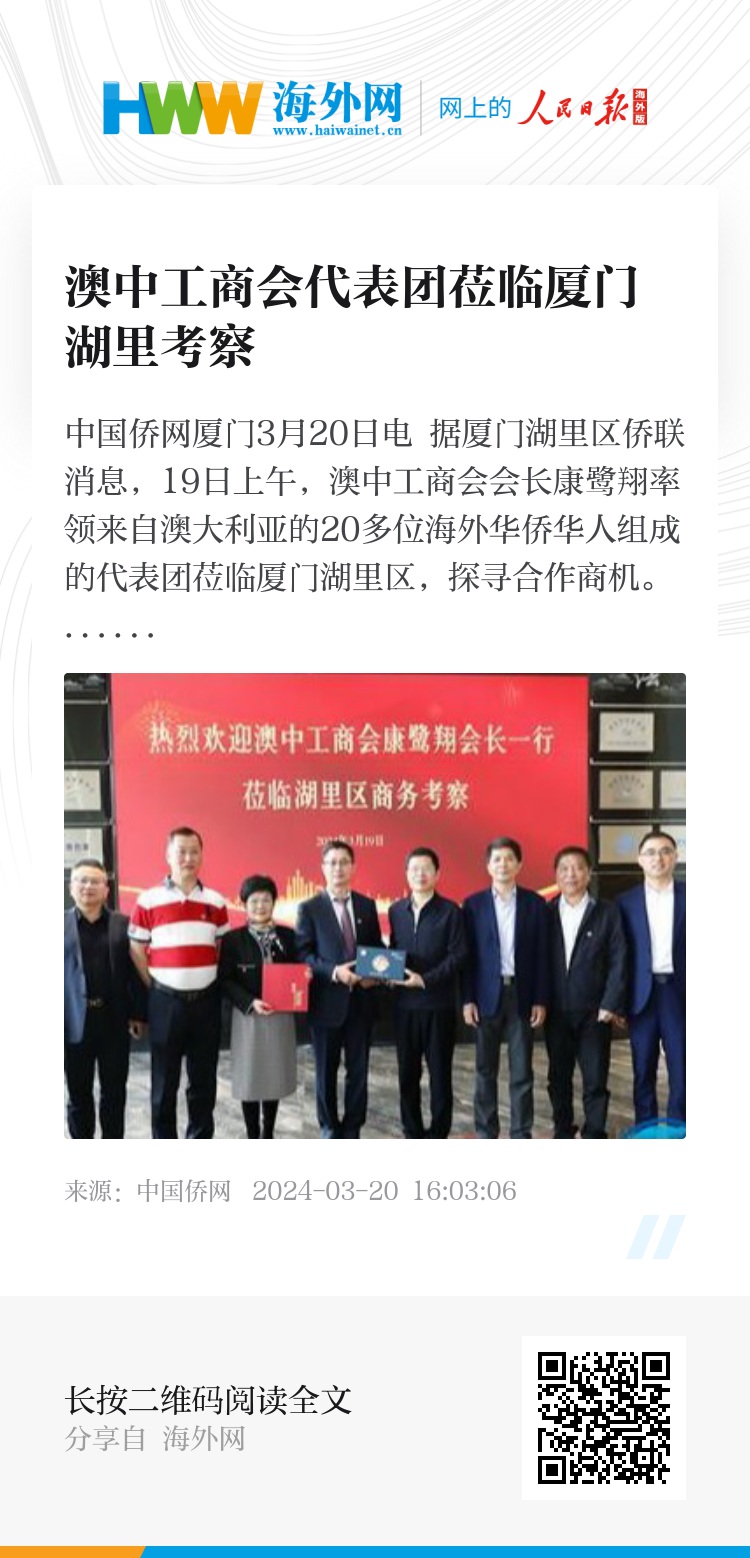 中国侨网厦门3月20日电 据厦门湖里区侨联消息,19日上午,澳中工商会会长康鹭翔率领来自澳大利亚的20多位海外华侨华人组成的代表团莅临厦门湖里区,探寻合作商机。