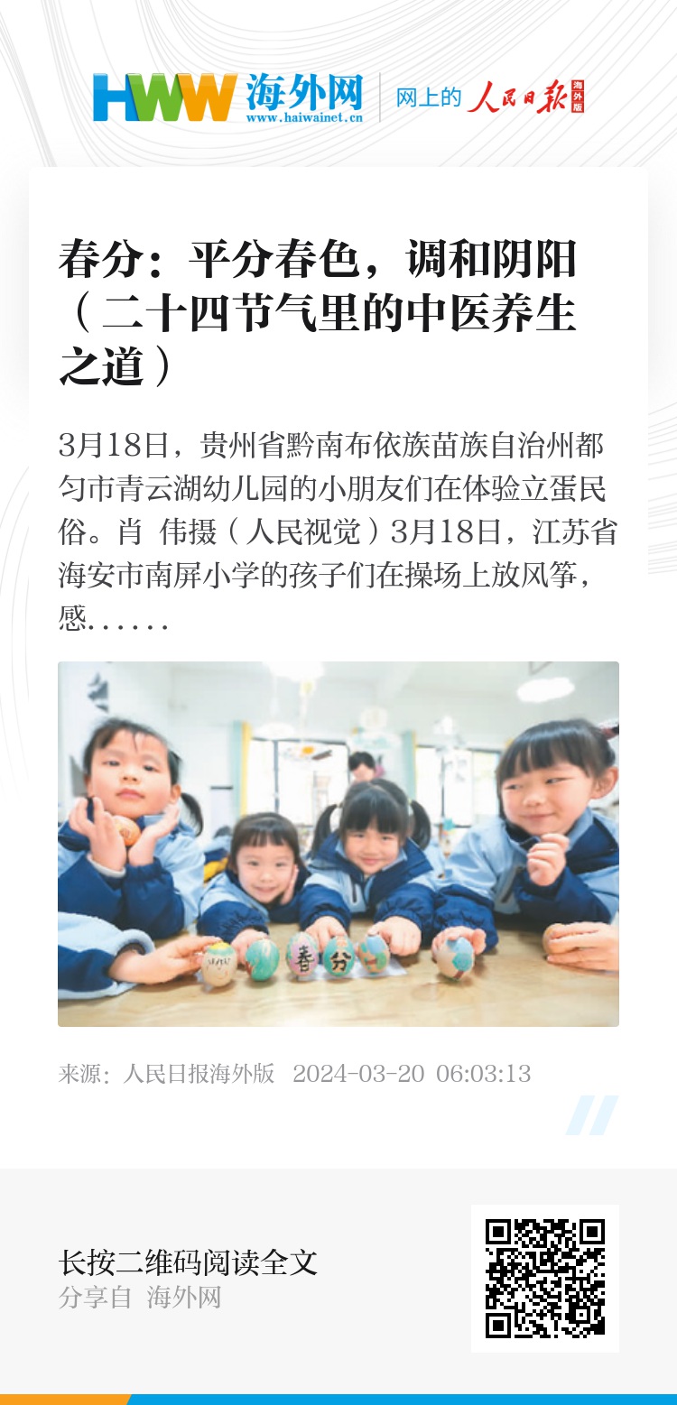 为什么春分要立蛋?有一种说法是春分日昼夜等长,具有平衡之意,在这一天立蛋意在提醒人们注意阴阳平衡,让身体更加健康。《黄帝内经》说“春夏养阳,秋冬养阴”,养生讲究顺应四时季节的变化进行调养。正所谓春生、夏长、秋收、冬藏,春天是生发的季节,阳气逐渐生发、生长,此时应特别注意养护好体内的阳气。