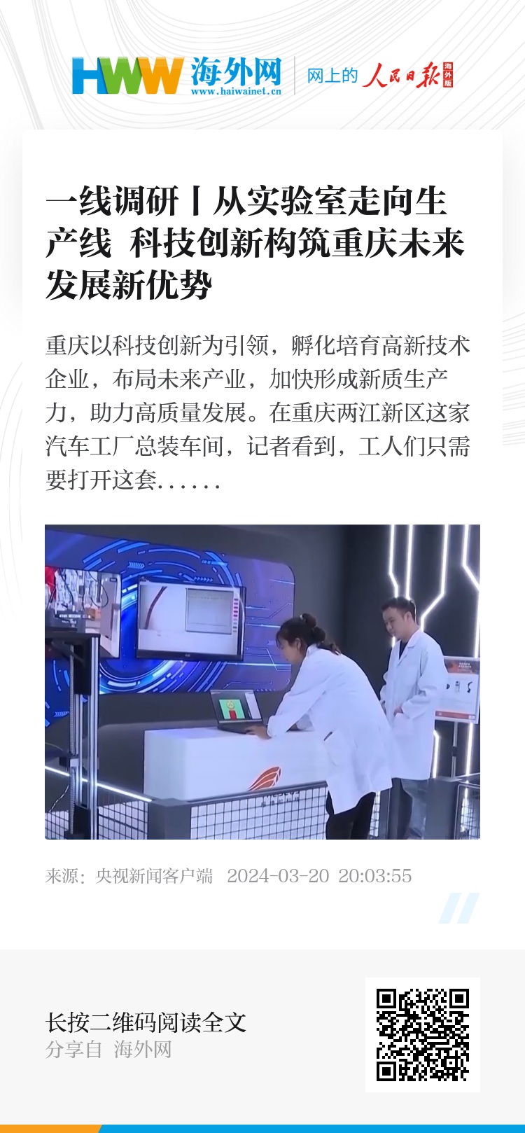 为助力科研成果从实验室走向生产线,重庆高新技术产业研究院,为科研团队提供中试平台、市场管理团队、规模化生产车间以及产业基金投资等,已成功孵化53个重大原创科技成果落地,培育13家国家高新技术企业,产值超15亿元。