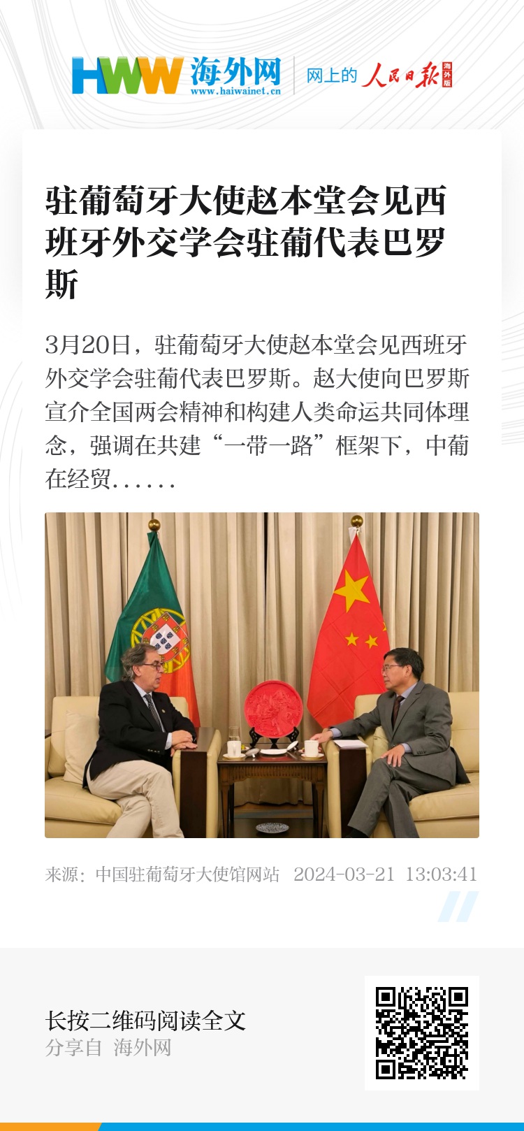 赵大使向巴罗斯宣介全国两会精神和构建人类命运共同体理念,强调在共建“一带一路”框架下,中葡在经贸、文化、教育等各领域取得良好成效。期待并相信两国将继续秉持相互尊重、互利共赢的原则,为中葡全面战略伙伴关系增添新内涵。