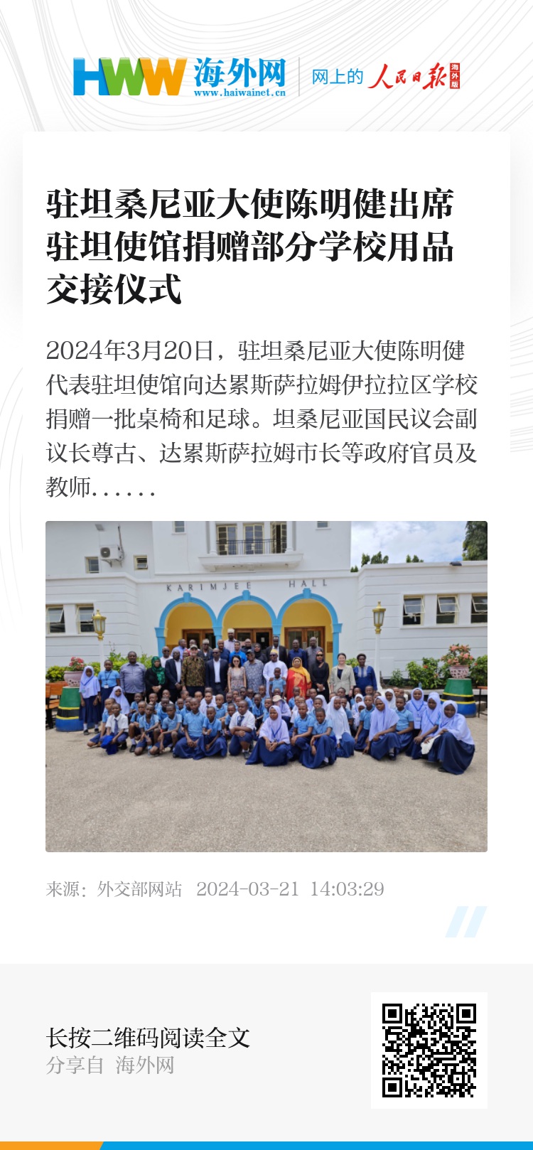 2024年3月20日,驻坦桑尼亚大使陈明健代表驻坦使馆向达累斯萨拉姆伊拉拉区学校捐赠一批桌椅和足球。坦桑尼亚国民议会副议长尊古、达累斯萨拉姆市长等政府官员及教师和学生代表等共约100人出席。